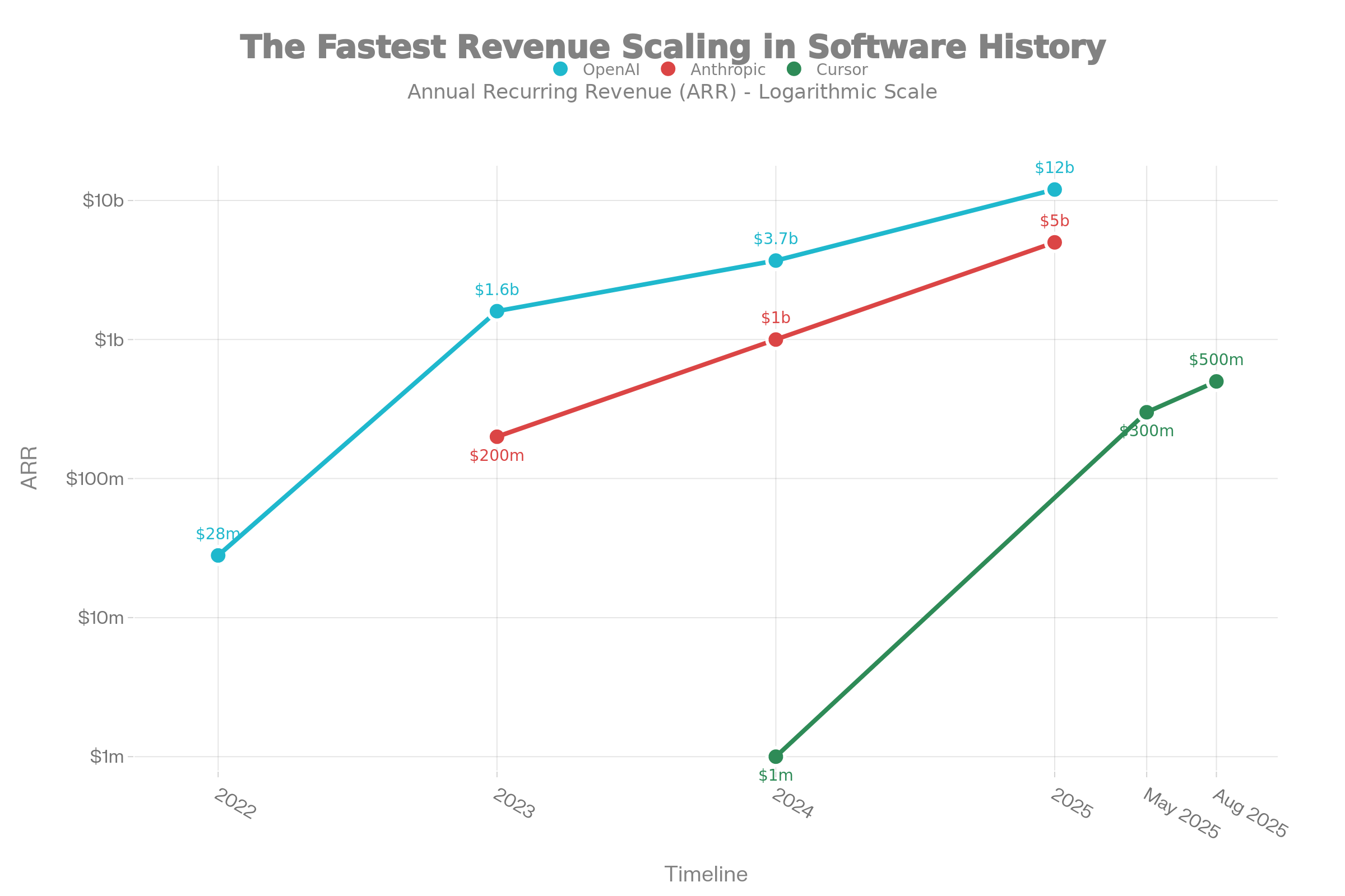 OpenAI: The company’s revenue soared from roughly $28M in 2021-2022 to surpassing $12B ARR by July 2025. This is the fastest growth to $10B in software history.