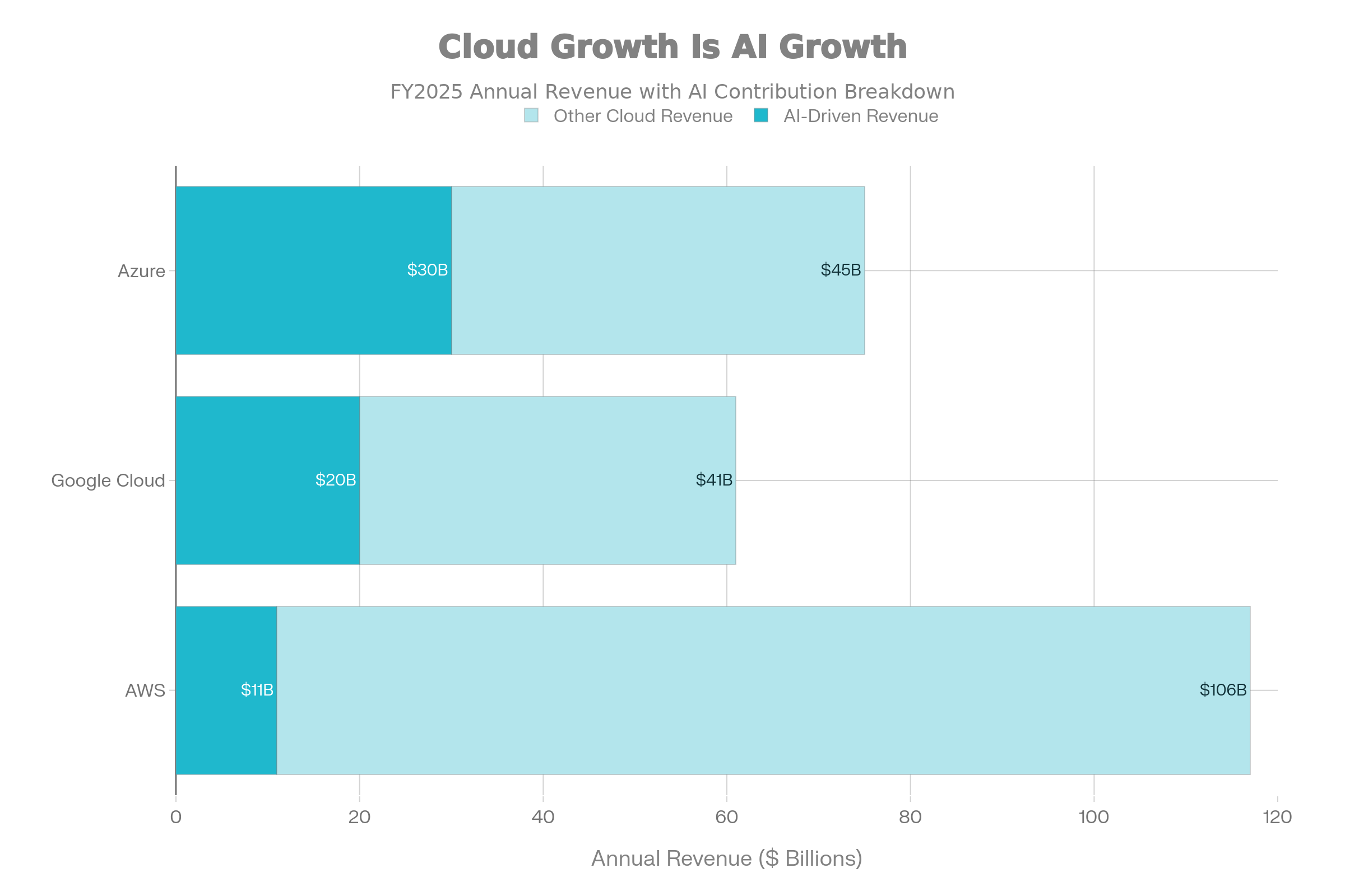 Microsoft Azure: The platform grew 39% YoY in fiscal Q4 2025, reaching an annualized revenue run rate of over $75B. Crucially, Microsoft management disclosed that AI services contributed roughly 16 percentage points of that growth. In other words, AI is now driving more than 40% of Azure’s total expansion.