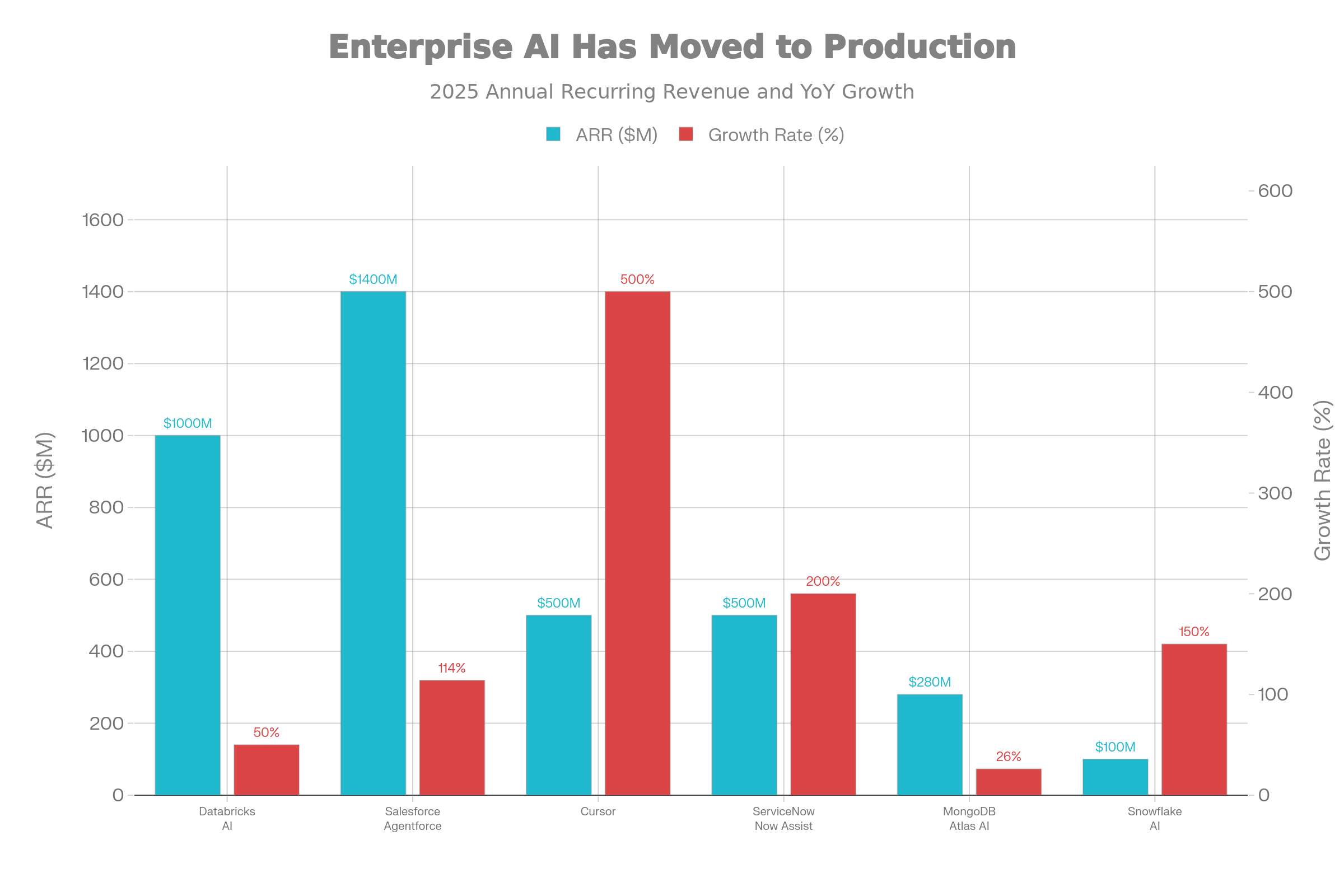 Databricks: Perhaps the clearest signal of enterprise AI spending is Databricks hitting $4B in annualized revenue, with AI products alone accounting for over $1B of that total. The company is growing over 50% YoY and maintains a net retention rate exceeding 140%, with over 650 customers each spending more than $1M annually. This is production-scale AI infrastructure spending, not pilots.