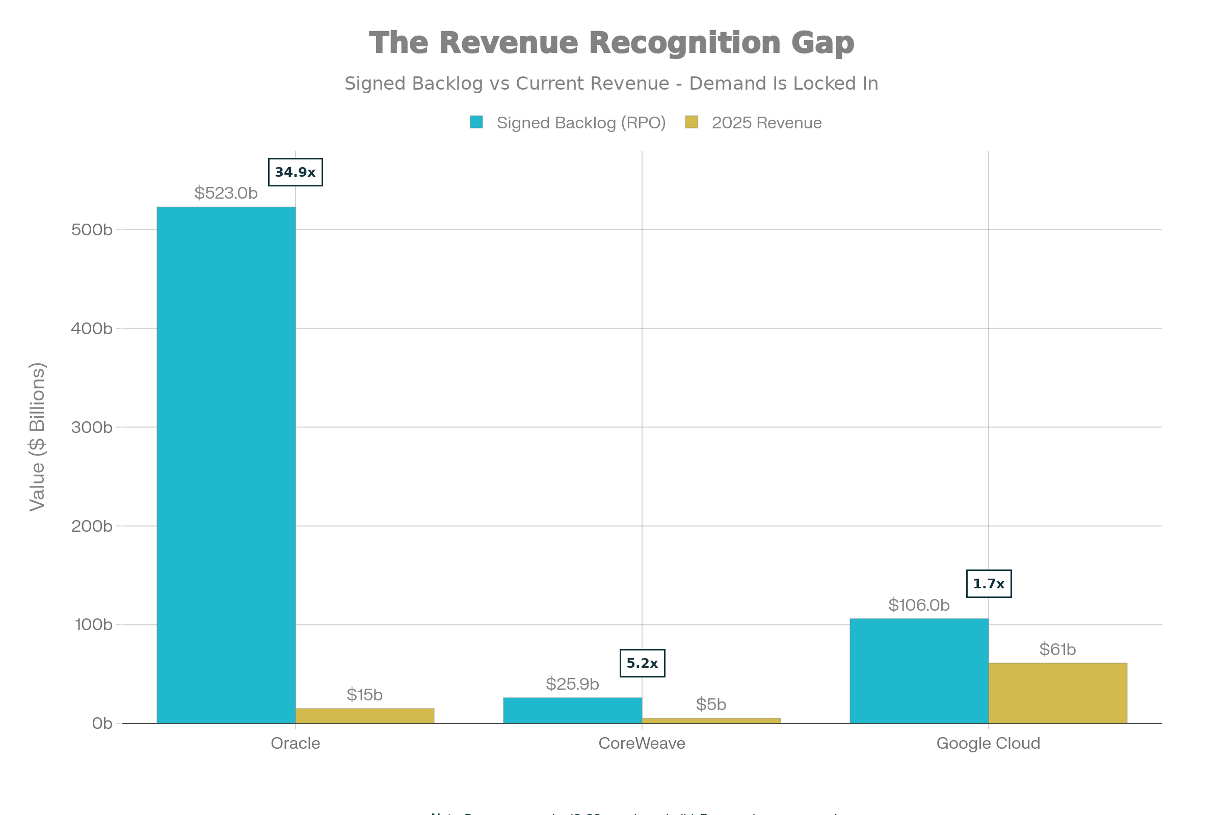 Oracle has billions in signed contracts (Remaining Performance Obligations, or RPO) that surged 438% YoY to $523B in Q2 fiscal 2026. The company added $68B in new commitments in the quarter alone, including major contracts with Meta and Nvidia. However, you cannot recognize cloud revenue until the datacenter is built, the GPUs are racked, and the keys are handed to the customer. Only 33% of Oracle’s RPO converts to revenue within 12 months, with the remaining 67% delayed for years as infrastructure is constructed. Oracle is building 72 multicloud datacenters to be embedded in Amazon, Google, and Microsoft clouds, plus over 211 regions worldwide. This is a build-out story, not a demand story.